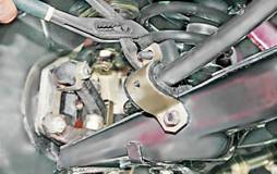 10. Шлицевой отверткой извлекаем резиновую подушку из кронштейна. 11. Аналогично снимаем подушку второго кронштейна. Установка 1. Установка стабилизатора поперечной устойчивости выполняется в обратной последовательности. 2. Если штангу стабилизатора не заменяли, то ориентируем подушки стабилизатора по ранее нанесенным меткам. 3. Заворачиваем гайки крепления кронштейнов стабилизатора. 4. Сначала устанавливаем обойму на нижнюю шпильку рычага и заворачиваем гайку на 2-3 оборота. Раздвижными пассатижами поджимаем обойму и наживляем вторую гайку.
