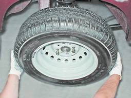 Аналогично отворачиваем оставшиеся две гайки. 6. Снимать полуось удобнее специальным съемником, но при его отсутствии можно воспользоваться снятым колесом. Закрепляем его двумя болтами наружной стороной к фланцу полуоси, при этом болты полностью не заворачиваем для обеспечения действия силы инерции колеса. Резким движением на себя выдергиваем подшипник полуоси из фланца балки заднего моста.