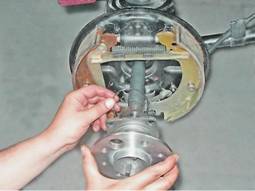 7. Отвернув болты, снимаем колесо и вынимаем полуось. Между фланцем балки и тормозным щитом установлено резиновое уплотнительное кольцо, не потеряйте его.