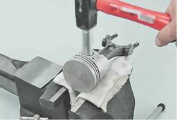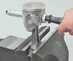 6. Устанавливаем шатун в тиски и снимаем с поршня два компрессионных и одно маслосъемное кольцо с расширителем. Внимание! При последующей установке нижнее компрессионное кольцо устанавливается фаской вниз. 7. Через оправку выпрессовываем палец из шатуна и снимаем поршень.