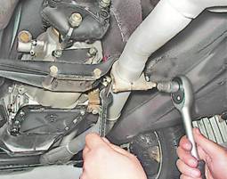 6. Торцовым ключом на 13 мм отворачиваем болт крепления хомута приемной трубы к кронштейну на коробке передач.