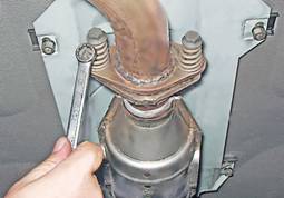 5. На автомобилях с системой впрыска топлива снимаем дополнительный грязезащитный щиток (см. с. 221 , "Грязезащитный щиток - снятие и установка") и датчик концентрации кислорода (см. "Датчик концентрации кислорода - проверка и замена"). Накидным ключом на 13 мм отворачиваем два болта крепления фланца приемной трубы к фланцу нейтрализатора и разъединяем их.