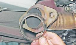 10. Поворачивая приемную трубу, выводим ее вниз в пространстве между картером сцепления и средней рулевой тягой. Установка 1. Наносим на место соединения приемной трубы с дополнительным глушителем и резьбовые соединения графитную смазку. 2. Уплотнительную прокладку заменяем новой. 3. На автомобилях с системой впрыска заменяем металлографитное уплотнительное кольцо. 4. Установка приемной трубы выполняется в обратной последовательности. Внимание! Не забудьте о необходимости контровки гаек крепления трубы к коллектору. |