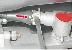 4. На автомобиле с впрысковым двигателем снимаем датчик скорости (см. "Датчик скорости - снятие и установка"). 5. Ключом на 10 мм отворачиваем гайку крепления привода спидометра.