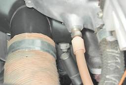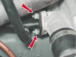 12. Ключом на 10 мм отворачиваем две гайки крепления трубки подвода охлаждающей жидкости к насосу и отсоединяем трубку. В месте соединения установлена уплотнительная прокладка.