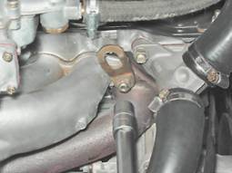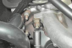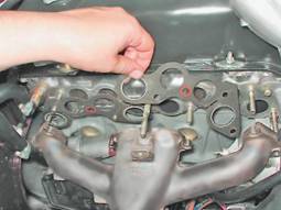 13. Торцовым ключом на 13 мм с удлинителем отворачиваем семь гаек крепления впускного трубопровода и выпускного коллектора. Под гайками совместного крепления впускного трубопровода и выпускного коллектора установлены шайбы увеличенной толщины.