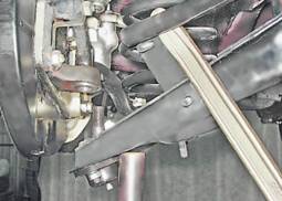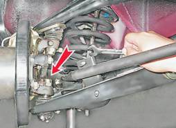 6. Приподнимая рычаг, запрессовываем палец нижней шаровой опоры и затягиваем самоконтрящуюся гайку. 7. Остальные детали устанавливаем в порядке, обратном их снятию. 8. Установив автомобиль на колеса, окончательно затягиваем гайки крепления нижнего рычага подвески к его оси и крепления обоймы подушки стабилизатора. 9. Аналогично заменяем вторую пружину. |