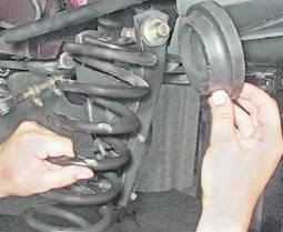 9. Убираем домкрат. 10. Поддев монтажной лопаткой пружину снизу, снимаем ее с опорной чашки нижнего рычага. 11. Снимаем пружину и изолирующую резиновую прокладку с верхней опорной чашки.