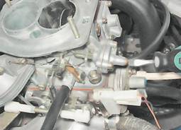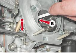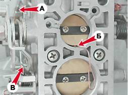 Величина зазора Б должна быть в пределах 0,7-0,8 мм. 10. Зазор регулируем перестановкой в другое отверстие наконечника тяги В приводов воздушной и дроссельной заслонок или подгибанием тяги. 11. Установка всех снятых деталей выполняется в обратной последовательности. |
