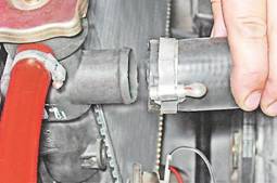 Радиатор - снятие и установкаСнятие 1. Устанавливаем автомобиль на смотровую яму или эстакаду (см. "Подготовка автомобиля к ТО и ремонту"). 2. Сливаем жидкость из системы охлаждения (см. "Охлаждающая жидкость - проверка уровня и замена"). 3. Снимаем электровентилятор (см. "Электровентилятор радиатора - снятие и установка"). 4. Ослабив хомут, снимаем подводящий шланг с верхнего патрубка радиатора.