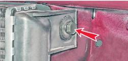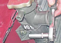 5. Отсоединяем от патрубка заливной горловины радиатора соединительный шланг (см. "Расширительный бачок - замена"). 6. Отсоединяем от входного патрубка термостата отводящий шланг радиатора (см. "Термостат - замена"). 7. Торцовым ключом на 10 мм отворачиваем болт крепления радиатора с левой стороны.