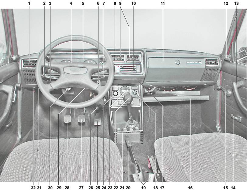 Органы управления и приборы: 1 - боковой дефлектор системы вентиляции; 2 - переключатель света фар; 3 - переключатель указателей поворота; 4 - выключатель звукового сигнала; 5 - щиток приборов; 6 - рукоятка сброса показаний счетчика суточного пробега; 7 - переключатель очистителей и омывателей ветрового стекла и блок-фар (в вариантном исполнении); 8 - заглушка; 9 - центральные дефлекторы системы вентиляции; 10 - блок управления системой вентиляции и отопления салона; 11 - вещевой ящик; 12 - ручка управления наружным зеркалом заднего вида; 13 - подлокотник; 14 - внутренняя ручка замка двери; 15 - ручка стеклоподъемника; 16 - вещевая полка; 17 - пепельница; 18 - прикуриватель; 19 - замок ремня безопасности; 20 - рычаг стояночного тормоза; 21 - клавишные выключатели; 22 - рычаг переключения передач; 23 - часы; 24 - регулятор яркости подсветки приборов; 25 - педаль "газа"; 26 - рычаг крышки отопителя; 27 - педаль тормоза; 28 - педаль сцепления; 29 - выключатель аварийной световой сигнализации (на фото не виден); 30 - выключатель (замок) зажигания; 31 - рукоятка гидрокорректора фар; 32 - ручка привода замка капота |