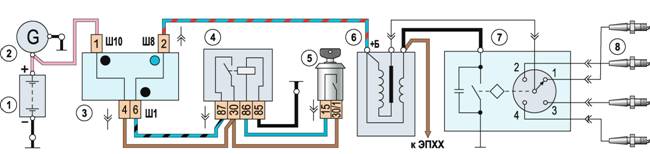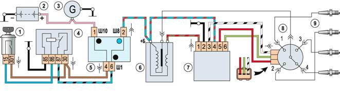 Схема контактной системы зажигания: 1 - аккумуляторная батарея; 2 - генератор; 3 - блок реле и предохранителей; 4 - реле зажигания; 5 - выключатель (замок) зажигания; 6 - катушка зажигания; 7 - распределитель зажигания; 8 - свечи зажигания