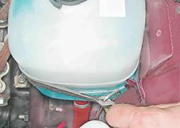Расширительный бачок - заменаСнятие Внимание! Снимать расширительный бачок следует только на холодном двигателе. 1. Подготавливаем автомобиль к выполнению работы (см. "Подготовка автомобиля к ТО и ремонту"). 2. Подготавливаем емкость (не менее 2 л) для слива охлаждающей жидкости. 3. Отстегиваем ремень крепления расширительного бачка.