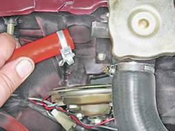 4. Плоскогубцами или шлицевой отверткой с узким лезвием ослабляем хомут крепления соединительного шланга к патрубку заливной горловины радиатора и снимаем шланг.