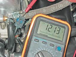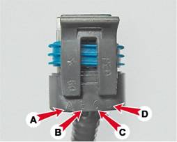 3. Подсоединяем "минусовой" щуп вольтметра к "массе" двигателя. 4. Включив зажигание, вольтметром измеряем напряжение на выводах А и D колодки жгута проводов.