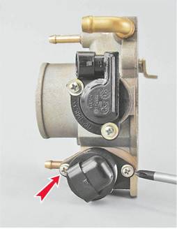 Внимание! Напряжение должно быть не меньше 12 В ("минусовой" щуп прибора должен быть подсоединен к "массе" двигателя). Если напряжение не поступает на колодку или оно меньше 12 В - разряжена аккумуляторная батарея, неисправна цепь питания или неисправен ЭБУ. 5. По окончании измерения напряжения выключаем зажигание. Снятие 1. Снимаем корпус дроссельной заслонки (см. "Корпус дроссельной заслонки - снятие и установка"). 2. Крестовой отверткой отворачиваем два винта крепления регулятора холостого хода к корпусу дроссельной заслонки.