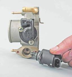 3. Снимаем регулятор холостого хода. В соединении регулятора и корпуса дроссельной заслонки установлено уплотнительное кольцо. Потерявшее эластичность или потрескавшееся кольцо заменяем.