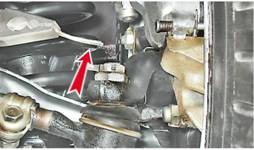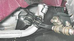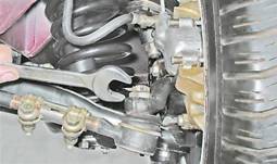 6. Сверху из моторного отсека торцовым ключом на 22 мм с удлинителем отворачиваем гайки (предварительно вынув шплинты) крепления пальцев боковых тяг к маятниковому рычагу (для правой тяги) и к сошке рулевого механизма (для левой тяги).