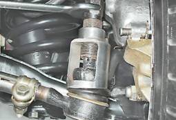 8. Перед разборкой боковой тяги измеряем и записываем ее длину. Это необходимо для того, чтобы при сборке не изменить имеющуюся величину схождения колес. Ослабляем болты стяжных хомутов соединительной муфты и вывинчиваем наконечники. Аналогично снимаем и разбираем другую боковую тягу. 9. Для снятия средней рулевой тяги расшплинтовываем и торцовым ключом на 22 мм с удлинителем из моторного отсека отворачиваем гайки. 10. Если пальцы шарниров боковых тяг отсоединены от маятникового рычага и сошки редуктора рулевого механизма, то при помощи съемника выпрессовываем пальцы шаровых шарниров тяги и снимаем ее.