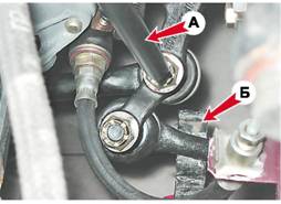 Внимание! При выполнении следующей операции (чтобы не повредить резьбу) гайки отворачиваем до совпадения их торцов с торцами пальцев. 11. Если боковые тяги не отсоединены от проушин сошки и маятникового рычага, то пальцы шаровых шарниров средней тяги можно выпрессовать, выбивая их с помощью подходящего стержня A. Предварительно подставляем упор Б под внутренний наконечник боковой тяги.