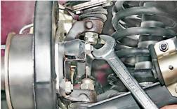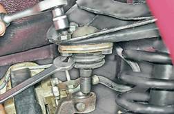 9. Снимаем верхнюю шаровую опору с прижимной пластиной и чехлом. 10. Для снятия нижней шаровой опоры рожковым ключом на 22 мм отворачиваем на 4-5 оборотов гайку крепления шарового пальца.
