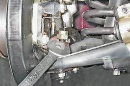 12. Отворачиваем гайку крепления нижнего шарового пальца. 13. Ключом на 13 мм отворачиваем три гайки крепления нижней шаровой опоры к рычагу.