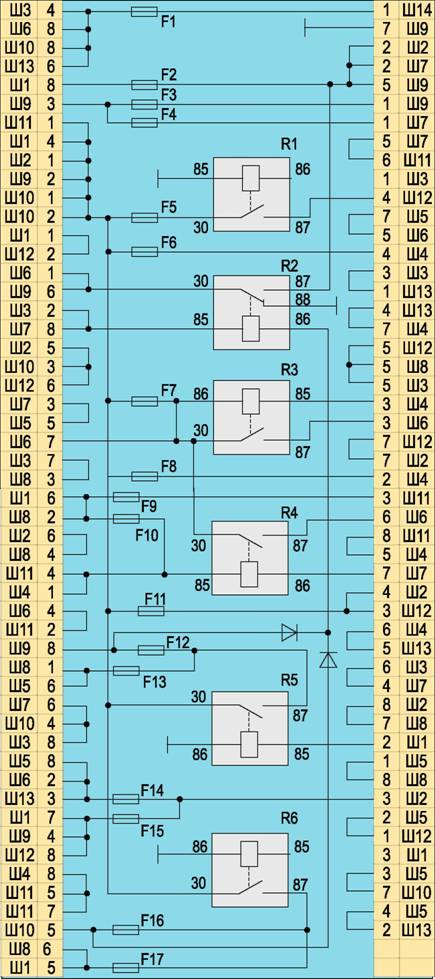 Схема соединений блока реле и предохранителей: