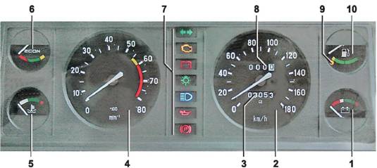 Щиток приборов: 1 - вольтметр; 2 - спидометр (указатель скорости движения автомобиля); 3 - одометр (счетчик пройденного пути); 4 - тахометр. Указывает частоту вращения коленчатого вала. Желтая зона шкалы обозначает режим работы двигателя с высокой частотой вращения коленчатого вала, красная зона - недопустимые режимы. Максимально разрешенные обороты двигателя - 6000 об/мин; 5 - указатель температуры охлаждающей жидкости. Стрелка в зеленой зоне шкалы указывает на нормальную температуру охлаждающей жидкости. Красная зона - перегрев двигателя. Запрещается эксплуатировать автомобиль при температуре охлаждающей жидкости свыше 118°С; 6 - эконометр. Помогает подобрать наиболее экономичный (с точки зрения расхода топлива) режим работы двигателя при движении автомобиля. При этом стрелка прибора находится в зеленой зоне шкалы; 7 - блок контрольных ламп: