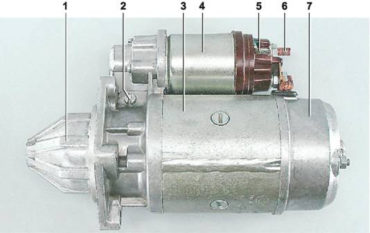 Стартер 4216.3708-02: 1 - передняя крышка; 2 - ось рычага привода; 3 - корпус; 4 - тяговое реле стартера; 5 - вывод "50" тягового реле; 6 - контактный болт; 7 - задняя крышка стартераПримечание В зависимости от комплектации на автомобиль могут быть установлены стартеры моделей 4216.3708-02 или 5722.3708. Стартер состоит из корпуса, якоря с шестерней привода и обгонной муфтой, двух крышек и тягового электромагнитного реле. Крышки и корпус стартера стянуты в единое целое двумя шпильками, проходящими внутри. Шпильки изолированы от обмоток статора пластмассовыми трубками. Между передней крышкой и корпусом установлена перегородка с резиновым уплотнительным кольцом.