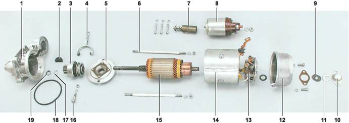 Детали стартера 4216.3708-02: 1 - передняя крышка; 2 - уплотнитель; 3 - обгонная муфта с шестерней привода; 4 - рычаг привода; 5 - перегородка; 6 - стяжная шпилька; 7 - шток; 8 - тяговое реле стартера; 9 - регулировочные шайбы; 10 - кожух вала якоря; 11 - стопорная шайба; 12 - задняя крышка стартера; 13 - щеткодержатель; 14 - корпус со статором; 15 - якорь стартера; 16 - ось рычага привода; 17 - стопорное кольцо; 18 - уплотнительное кольцо; 19 - ограничительное кольцо хода шестерни