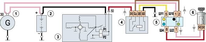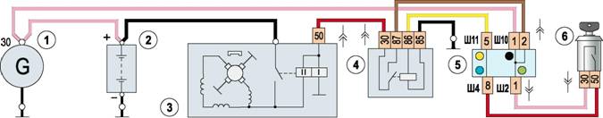 Схема электрических соединений стартера 4216.3708-02: 1 - генератор; 2 - аккумуляторная батарея; 3 - стартер; 4 - реле включения стартера*; 5 - монтажный блок; 6 - выключатель (замок) зажигания