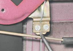11. Крестовой отверткой отворачиваем два винта крепления прижимной пластины троса к кронштейну стекла.