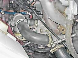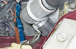 На автомобилях последних годов выпуска крепление шлангов к патрубкам термостата осуществляется ленточными хомутами, а к насосу охлаждающей жидкости и патрубку головки блока цилиндров - червячными. В этом случае удобнее ослабить червячные хомуты и снять термостат вместе со шлангами. 5. Торцовым ключом на 8 мм или крестовой отверткой ослабляем хомуты крепления шлангов к патрубкам насоса охлаждающей жидкости и головки блока цилиндров.