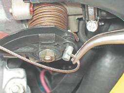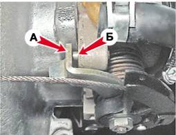Установка 1. Установка троса выполняется в обратной последовательности. 2. Привод регулируем, изменяя положение резьбового наконечника оболочки троса в кронштейне, отворачивая и заворачивая гайки крепления троса. Добиваемся, чтобы при отпущенной или нажатой до упора педали "газа" дроссельная заслонка была, соответственно, полностью закрыта или полностью открыта. При полностью закрытой заслонке площадка кронштейна А сектора касается регулировочного винта Б корпуса дроссельной заслонки.