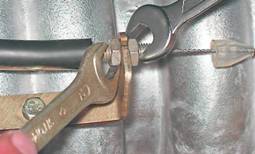 6. Двумя ключами на 13 мм ослабляем затяжку гаек крепления оболочки троса к кронштейну.