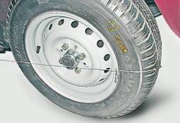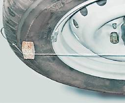 5. Закрепляем нить на протекторах с противоположной стороны автомобиля и под нить на боковину заднего колеса подкладываем брусок толщиной 6 мм.