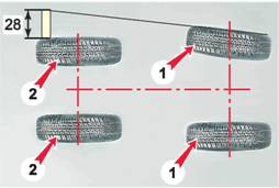 1 - передние колеса; 2 - задние колеса Таким образом, общая толщина брусков с одной стороны заднего колеса составит 28 (22+6) мм. При схождении 1 мм для одного переднего колеса нить должна слегка коснуться боковины его шины в диаметрально противоположных точках. В противном случае регулируем схождение колес. Для этого: а) Двумя ключами на 13 мм ослабляем стяжные хомуты муфты наружной рулевой тяги.