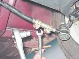 б) Раздвижными пассатижами вращаем муфту и регулируем длину тяги до исчезновения зазоров между нитью и боковиной шины переднего колеса.