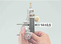 Это расстояние должно составлять 14+0,5 мм. 5. В случае необходимости подгибаем упор на кронштейне поплавка.