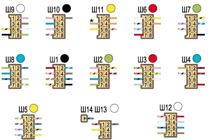 Условная нумерация контактов в колодках монтажного блока и цвета присоединяемых к ним проводов.