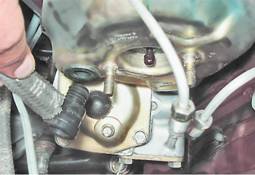 Вакуумный усилитель тормозов - заменаДля выполнения работы потребуется помощник, а также штангенциркуль, специальный ключ на 10 мм для тормозных трубок, прозрачная виниловая трубка подходящего диаметра, емкость для слива тормозной жидкости, свежая тормозная жидкость (см. "Эксплуатационные жидкости"). Снятие 1. Подготавливаем автомобиль к выполнению операций (см. "Подготовка автомобиля к ТО и ремонту"). 2. Снимаем главный тормозной цилиндр (см. "Главный тормозной цилиндр - снятие и установка"). 3. Вынимаем из корпуса усилителя обратный клапан со шлангом.