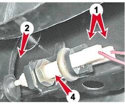 3. Ключом на 19 мм ослабляем контргайку 2 и, вращая выключатель 4, добиваемся его касания упора педали 3. 4. Затягиваем контргайку и в произвольном порядке подсоединяем колодки проводов. Если неполное растормаживание тормозных механизмов не удалось устранить регулировкой положения выключателя сигналов торможения, то необходимо проверить величину выступания головки штока относительно плоскости на корпусе вакуумного усилителя тормозов (см. "Вакуумный усилитель тормозов - замена"). |