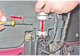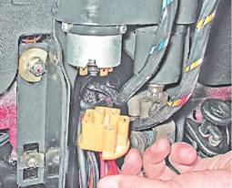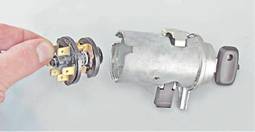 Выключатель (замок) зажигания - снятие и установка, проверка и замена контактной группыСнятие 1. Подготавливаем автомобиль к выполнению операций (см. "Подготовка автомобиля к ТО и ремонту"). 2. Отсоединяем провод от отрицательного вывода аккумуляторной батареи (см. "Аккумуляторная батарея - снятие и установка"). 3. Снимаем кожухи вала рулевой колонки (см. "Кожухи рулевого вала - снятие и установка"). 4. Отсоединяем колодку жгута проводов от контактов выключателя (замка) зажигания.