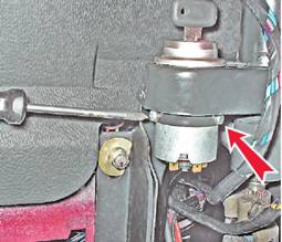 5. Вставляем ключ в замок зажигания. Переводим ключ в положение "0" и слегка поворачиваем рулевое колесо вправо-влево для того, чтобы разблокировать рулевой вал. 6. Крестовой отверткой отворачиваем два винта крепления замка к кронштейну рулевого вала.