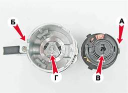 Сборка 1. Устанавливаем контактную группу замка, совмещая широкий выступ А на контактной группе с широким пазом Б на корпусе замка и при этом совмещаем паз В в торце оси контактной группы с торцовым выступом Г оси замка.