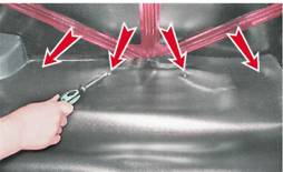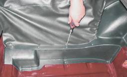 3. При помощи того же инструмента извлекаем из отверстий в кузове два пластмассовых фиксатора заднего крепления коврика багажника (на фото показан один фиксатор).