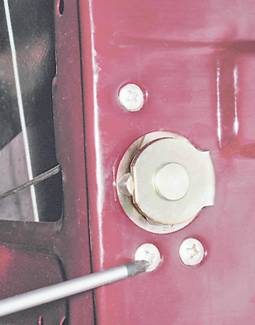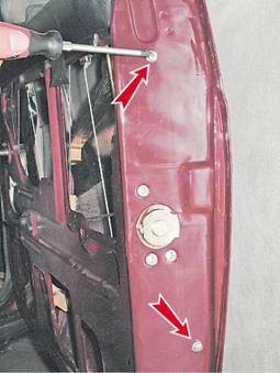 Замок, личинка и наружная ручка передней двери - снятие и установкаСнятие замка двери 1. Подготавливаем автомобиль к выполнению операций (см. "Подготовка автомобиля к ТО и ремонту"). 2. Устанавливаем стекло в верхнее положение. 3. Снимаем обивку двери (см. "Обивка передней двери - снятие и установка"). 4. Крестовой отверткой с торца двери отворачиваем два винта крепления задней направляющей стекла.