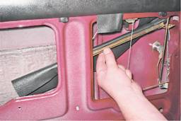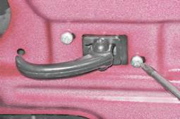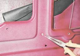 6. Сжав плоскогубцами лепестки держателя тяги, выталкиваем его из отверстия во внутренней панели двери.