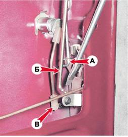 9. Снимаем резиновый фиксатор и отсоединяем от рычага замка тягу А привода наружной ручки. Шлицевой отверткой отсоединяем от рычага замка тягу Б кнопки блокировки и тягу В личинки.